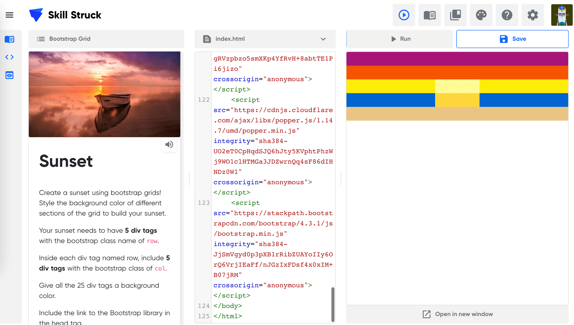 Students are introduced to an external library called Bootstrap and practice importing it into their HTML and CSS files.