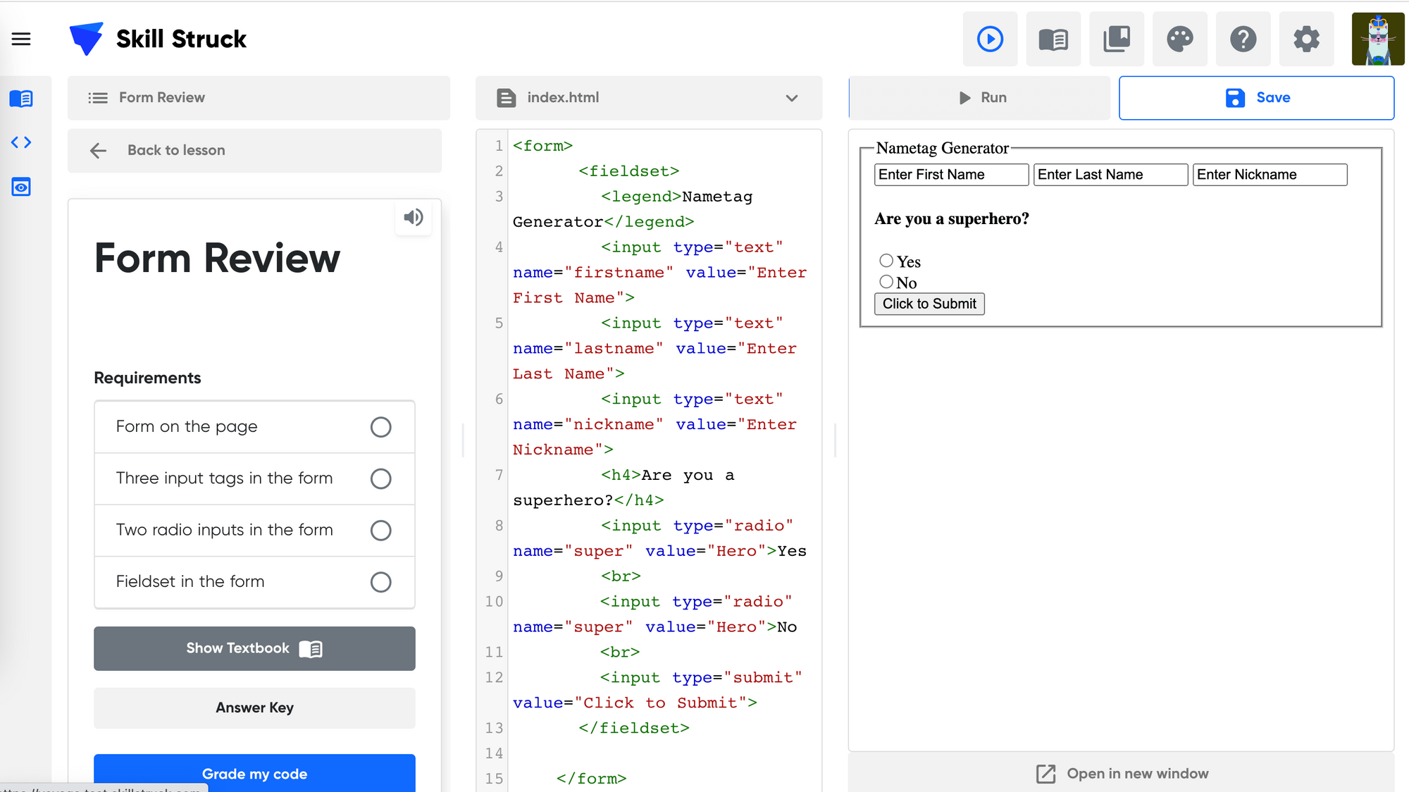 Students learn how to add radio inputs to their forms and add options for users to select on their code page.